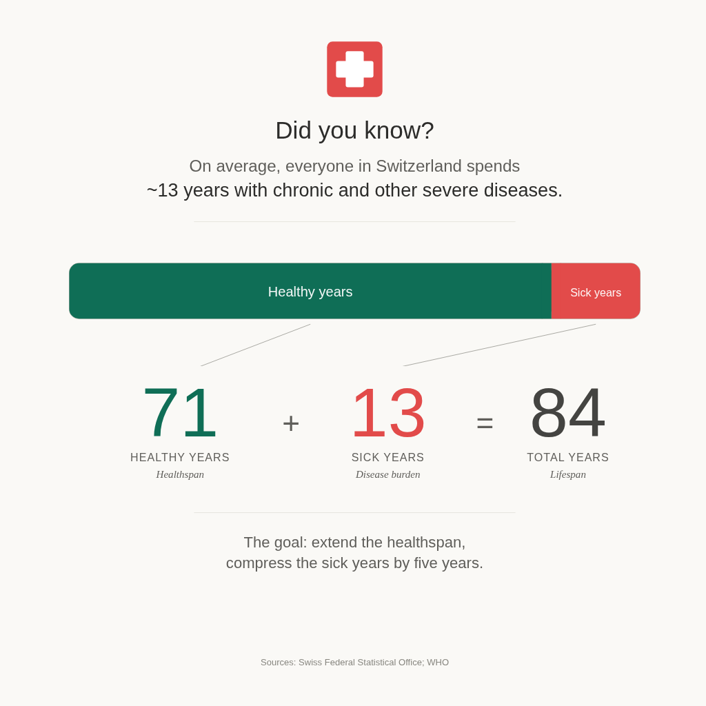 People in Switzerland spend, on average, ~13 years living with diseases during their lifetime, reducing their well-being and ability to work and live as they desire.
